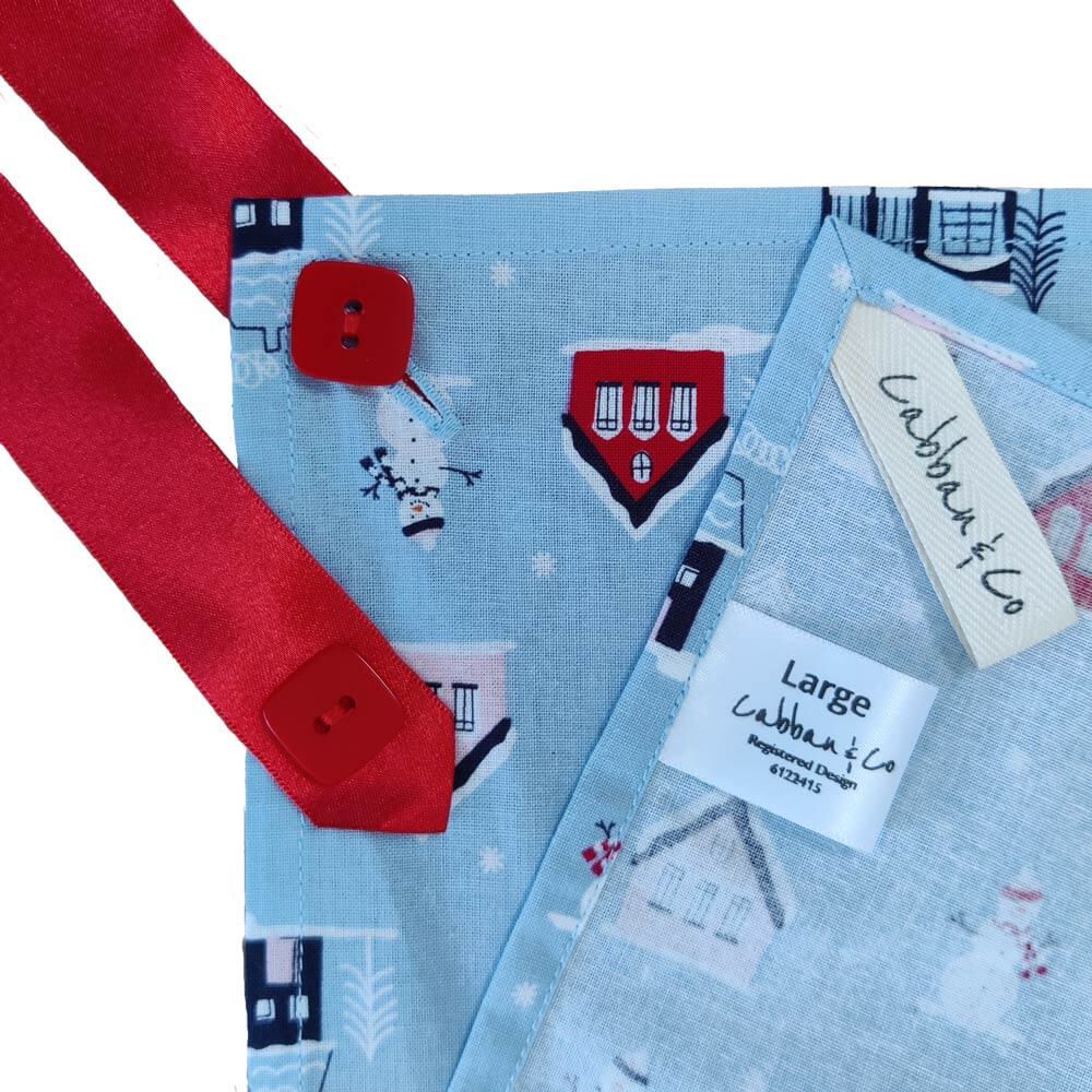 • One square of 100% cotton Fabric Gift Wrap; hemmed and a buttonhole sewn into 2 of the mitred corners